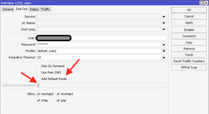 在Dial Out标签页中 Default Route Distance 要改为2,这是重点; Add Default Route勾不勾选没有什么影响,这里不勾选