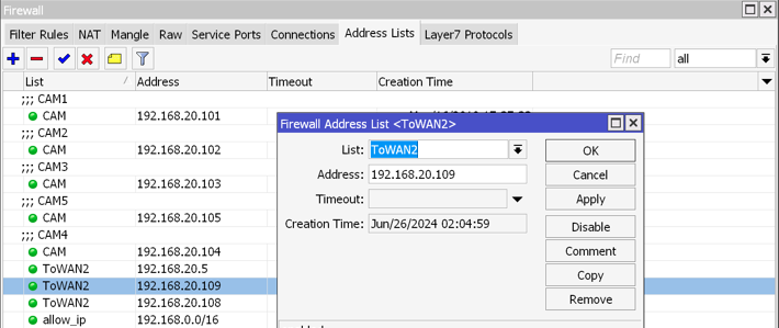 IP –> Firewall –> Address Lists 建立一个新的地址薄,日后需要走WAN2的内网地址直接加到这个地址簿里即可。