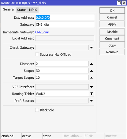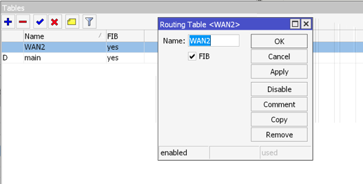 Routing –> Tables 新增一个名为「WAN2」的路由表,FIB选项要勾选。