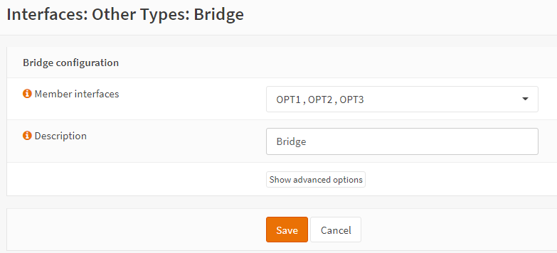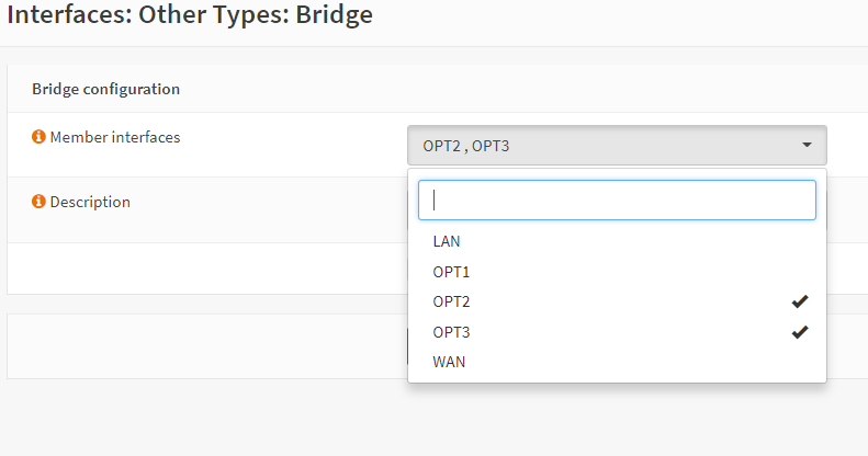 创建桥接器本身。选择并添加新桥接器。从成员接口中选择要添加到桥接器的未使用接口,OPT2、OPT3 等。