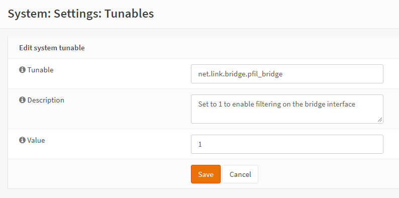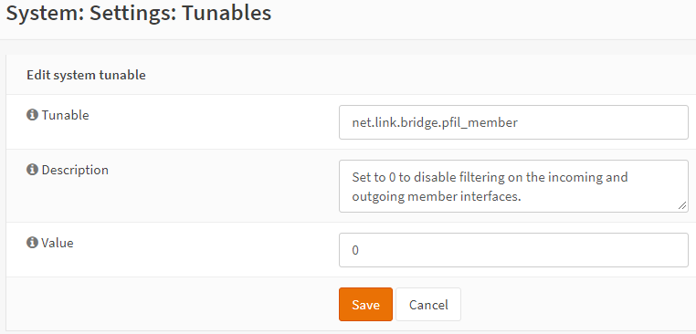 现在我们需要对系统可调参数进行两项更改,以确保过滤是在桥接器本身上进行的,而不是在成员接口上进行的。转到 ,使用笔形按钮选择 net.link.bridge.pfil_member,并将值设置为 0(如果您的安装中不存在此条目,则添加新记录)。