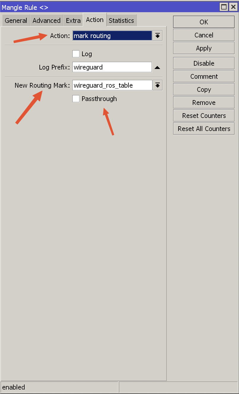 继续在Action设置为mark routing,设置New Routing Mark 为我们前面设置的路由表,取消掉Passthrough的勾选: