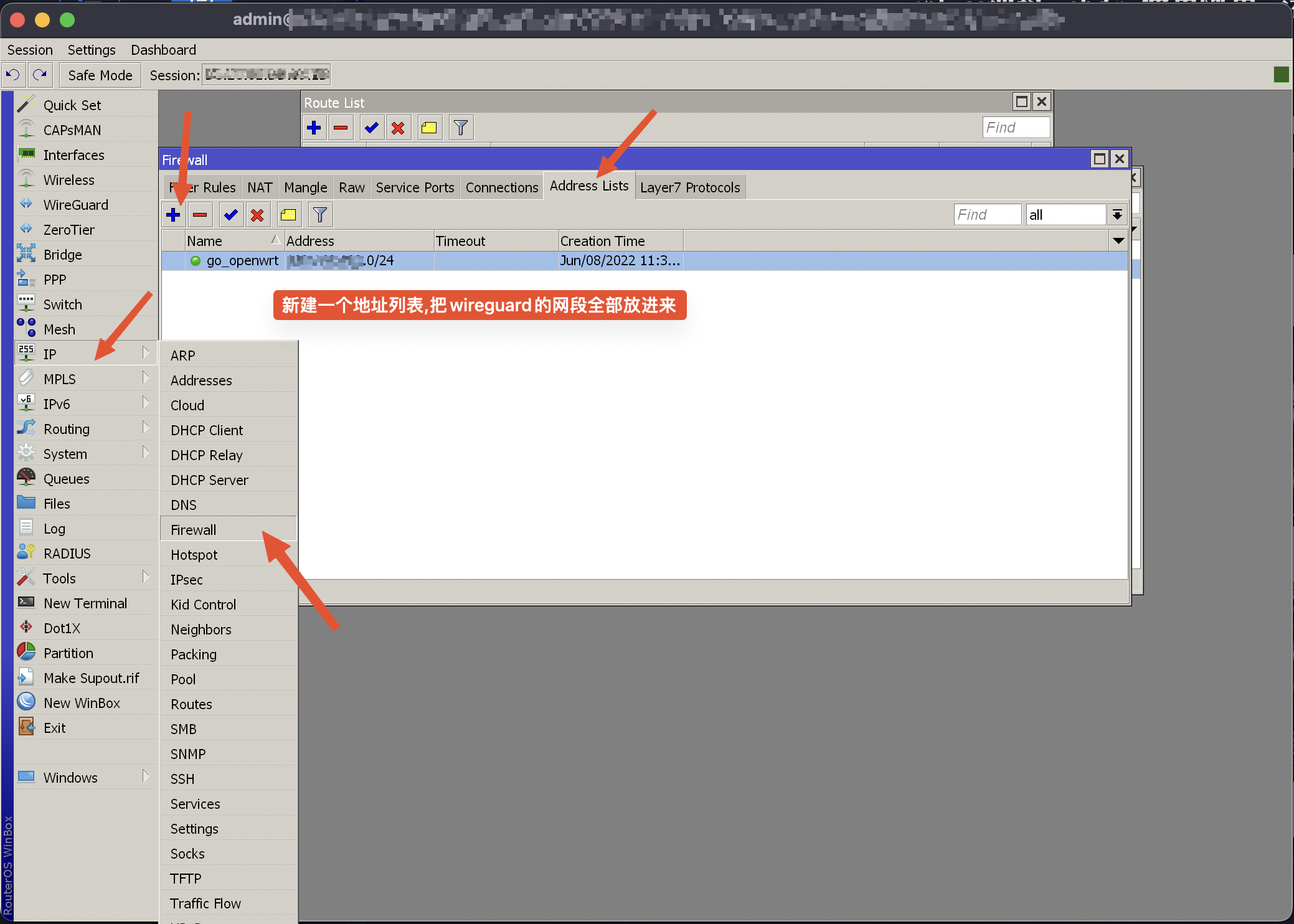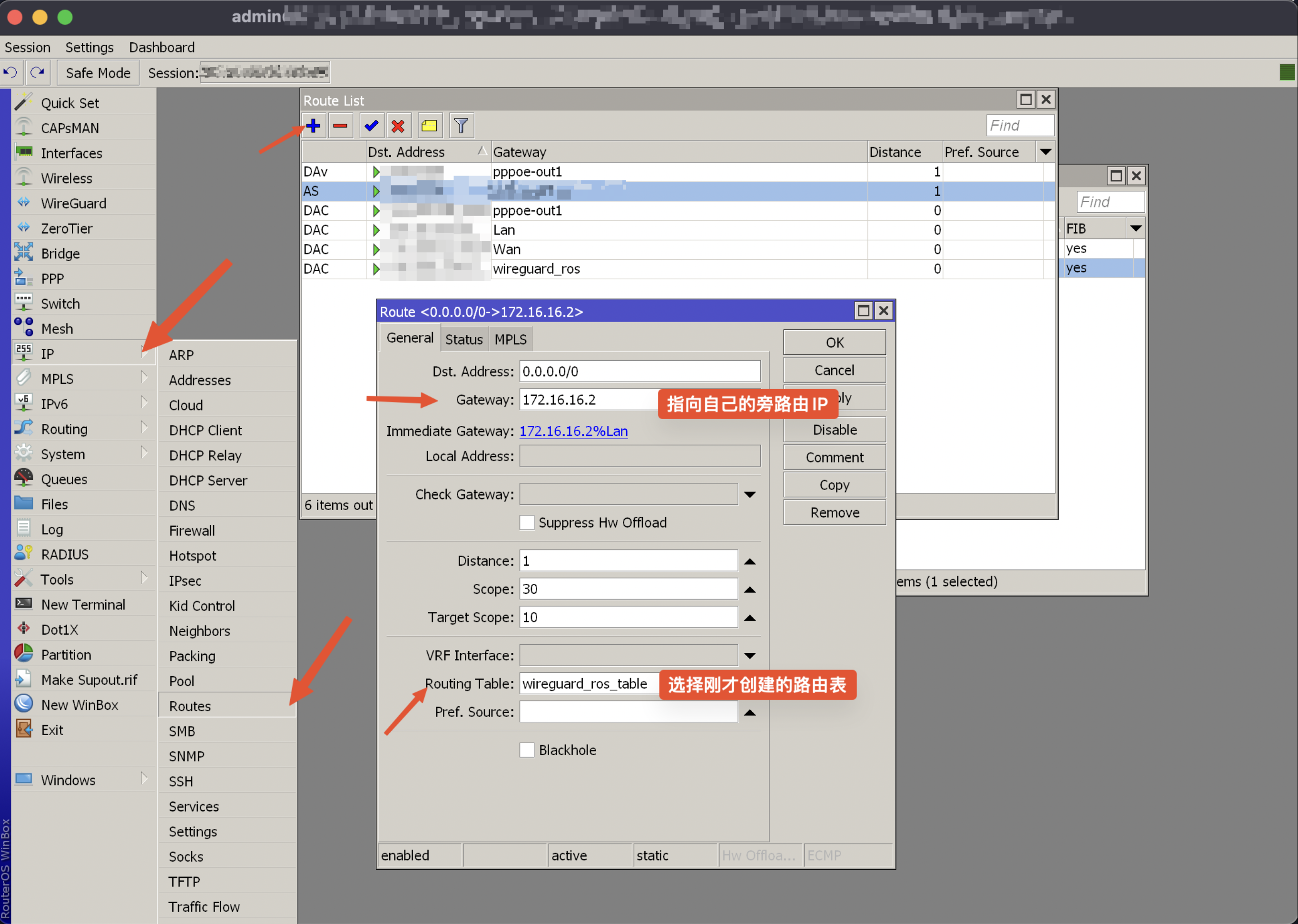wireguard在ros里面的配置就很简单了,简单说来就是新建了wireguard接口,配置一个ip,注意最好不要和目前的网络段冲突,然后配置好peer,能连上就ok.接下来才是这次的重点.