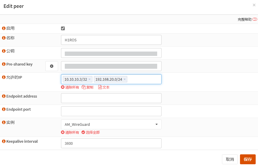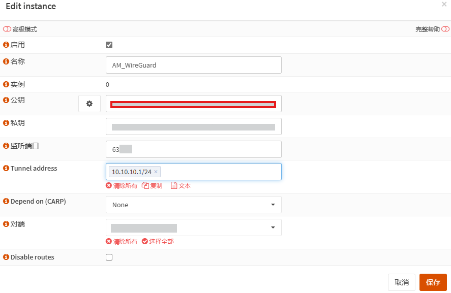 对端: 未配置peer前这里为空,配置peer后变为可选,可以把多个peer加入到这个Tunnel,即可多个网络使用同一个Tunnel。
