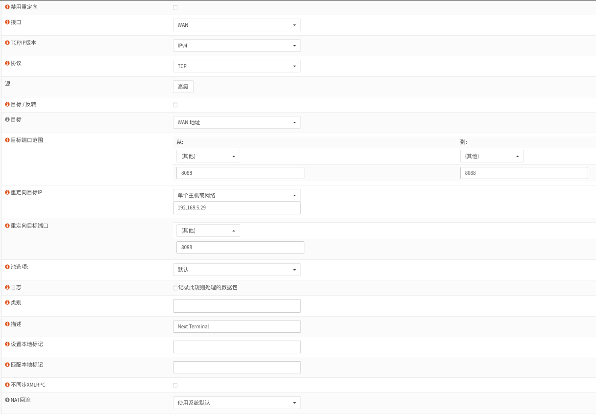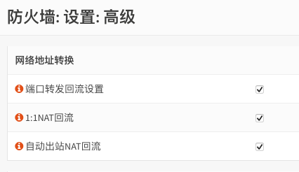 OPNSense端口映射和端口回流 By iok | 2024-11-05 0 Comment 例子: 需要把内网主机192.168.5.29的8088端口映射到公网地址的8088端口 , 内网的端口可以与映射到公网的端口不同。 OPN做端口映射比较简单,看图跟着做就是了,按自己的情况对应修改 防火墙 -> NAT -> 转发 需要留意几个: 目标:WAN地址 目标端口: 即你想访问的外网端口号 (可以与内网服务端口不同) 重定向目标IP:单个主机或者网络 (填写内网服务器的IP地址) 重定向目标端口:填写内网服务端口号 其他默认即可!点击保存后为自动生成防火墙WAN规则一条相对应,如下图 端口回流 – 解决内网机器无法访问公网端口映射服务的问题 打开以下三个选项即可: 防火墙 -> 设置 -> 高级