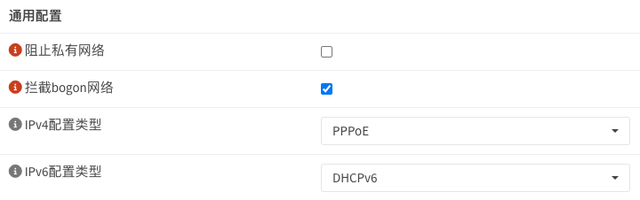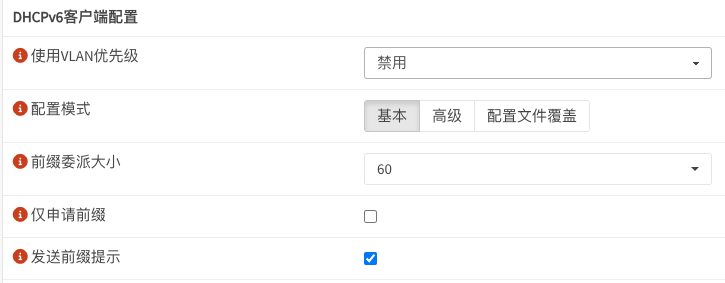 OPNSense打开IPV6支持 By iok | 2025-02-13 0 Comment 实验环境: 某ISP宽带(大内网),光猫桥接,OPNSense作为主路由PPPOE拨号,分配到IPv4为100开头的假公网IP地址 OPNSense设置很简单: 1)接口 – WAN页面 IPV6配置类型 选择「DHCPv6」 前缀委派大小「60」,发送前缀提示「勾选」,其他默认即可 2)接口 – LAN页面 IPV6配置类型 选择「跟踪接口」,跑路IPV6接口-父接口「WAN」 3)接口-概况 中就会看到WAN接口获取到IPV6地址了